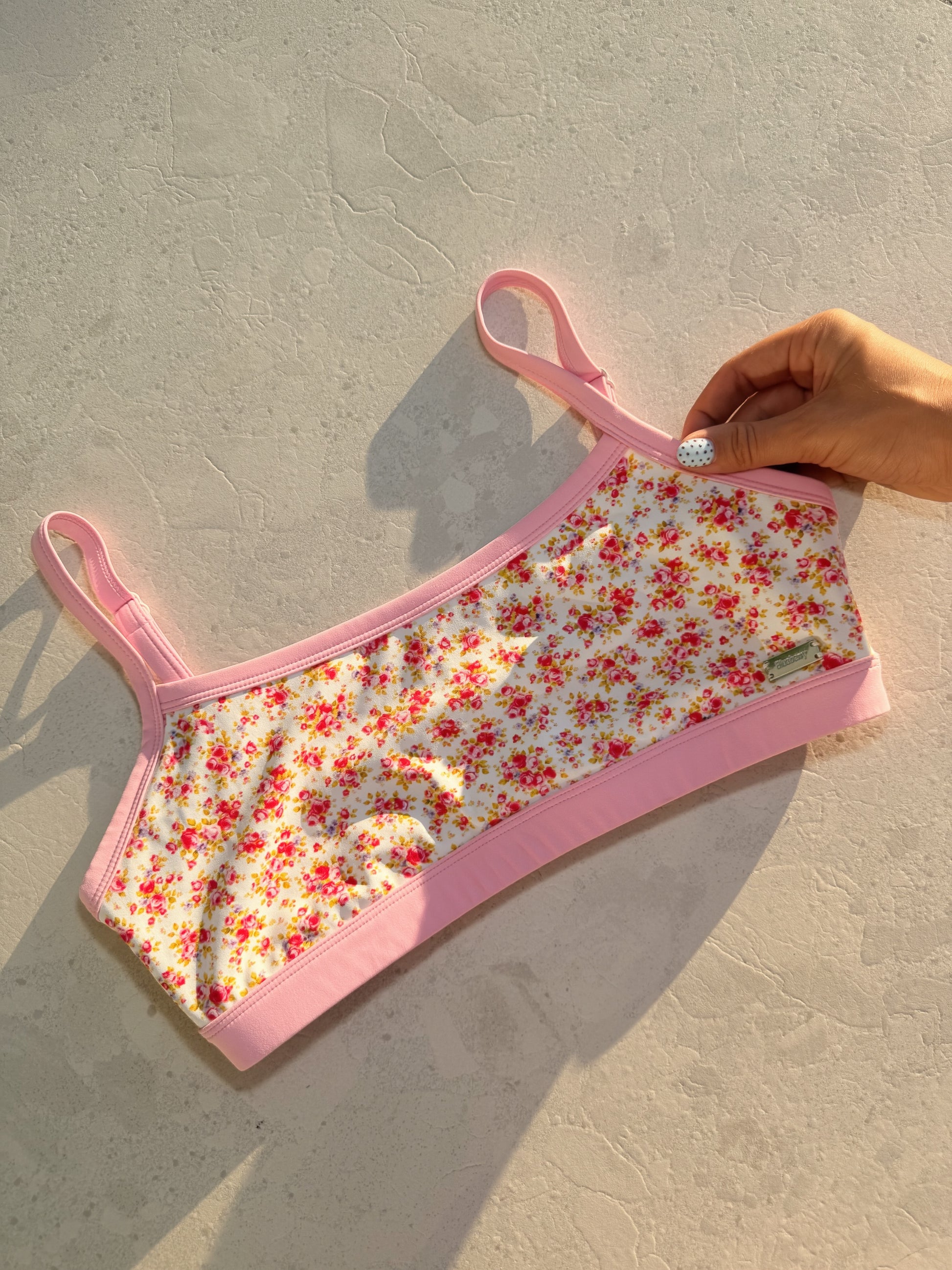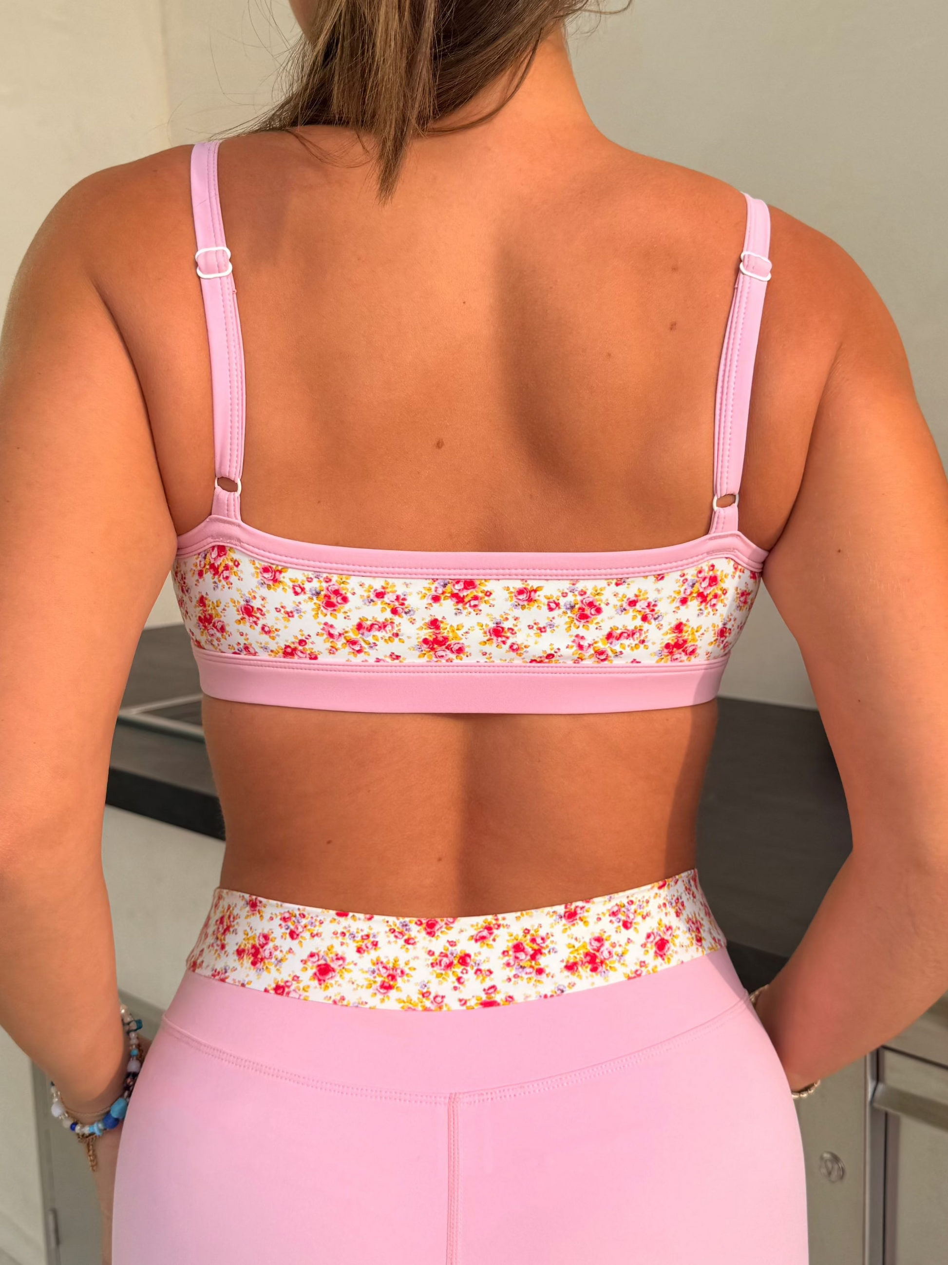 Meet your softest support system: The Honey Bra. This bra blends delicate, feminine details with everyday performance. It’s designed to feel as pretty as it is practical. Featuring a dainty floral print with contrast pink trim, it gives that effortlessly romantic look while still holding you in with a secure, comfortable fit. Made from our signature buttery-soft fabric, it offers support with a barely-there feel. The scoop neckline and slim straps create a flattering, open silhouette, while the underband keeps everything in place without restricting your movement. It’s the kind of piece you’ll wear for your workout and then keep on for the rest of your day. Pretty enough to show off, supportive enough to rely on.